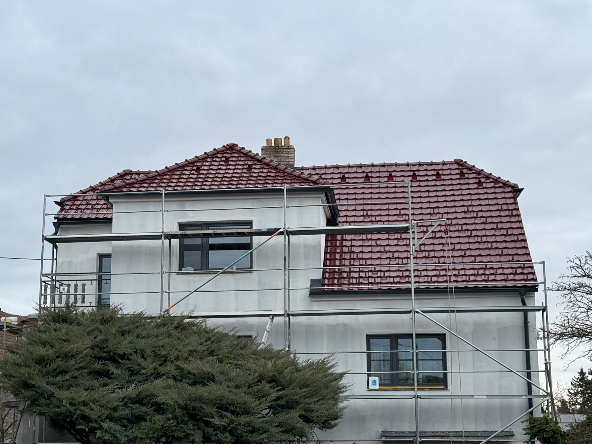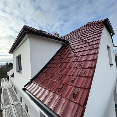 Celková rekonstrukce RD - demontáž a likvidace staré pálené tašky včetně oplechování. Nová střešní krytina od výrobce Tondach Contiton 12 v povrchové úpravě glazura v červenohnědé barvě. Oplechování a okap. systém je v antracitové barvě od výrobce KJG.