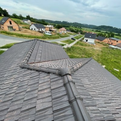 Pokrývačské a klempířské práce na novostavbě rodinného domu typu bungalov. Zvolená krytina je Tondach Renoton 14, povrchová úprava engoba v barvě grafen.